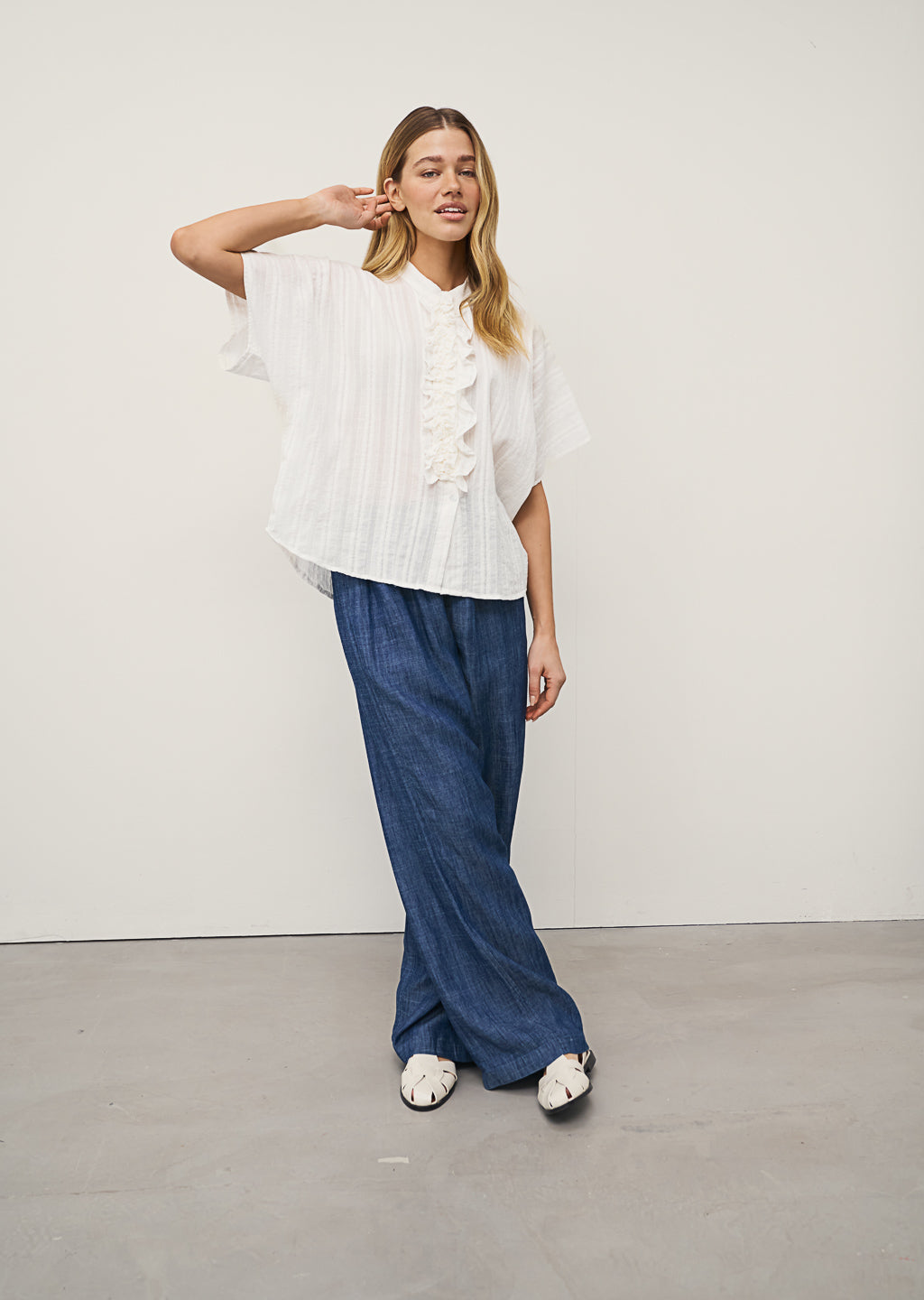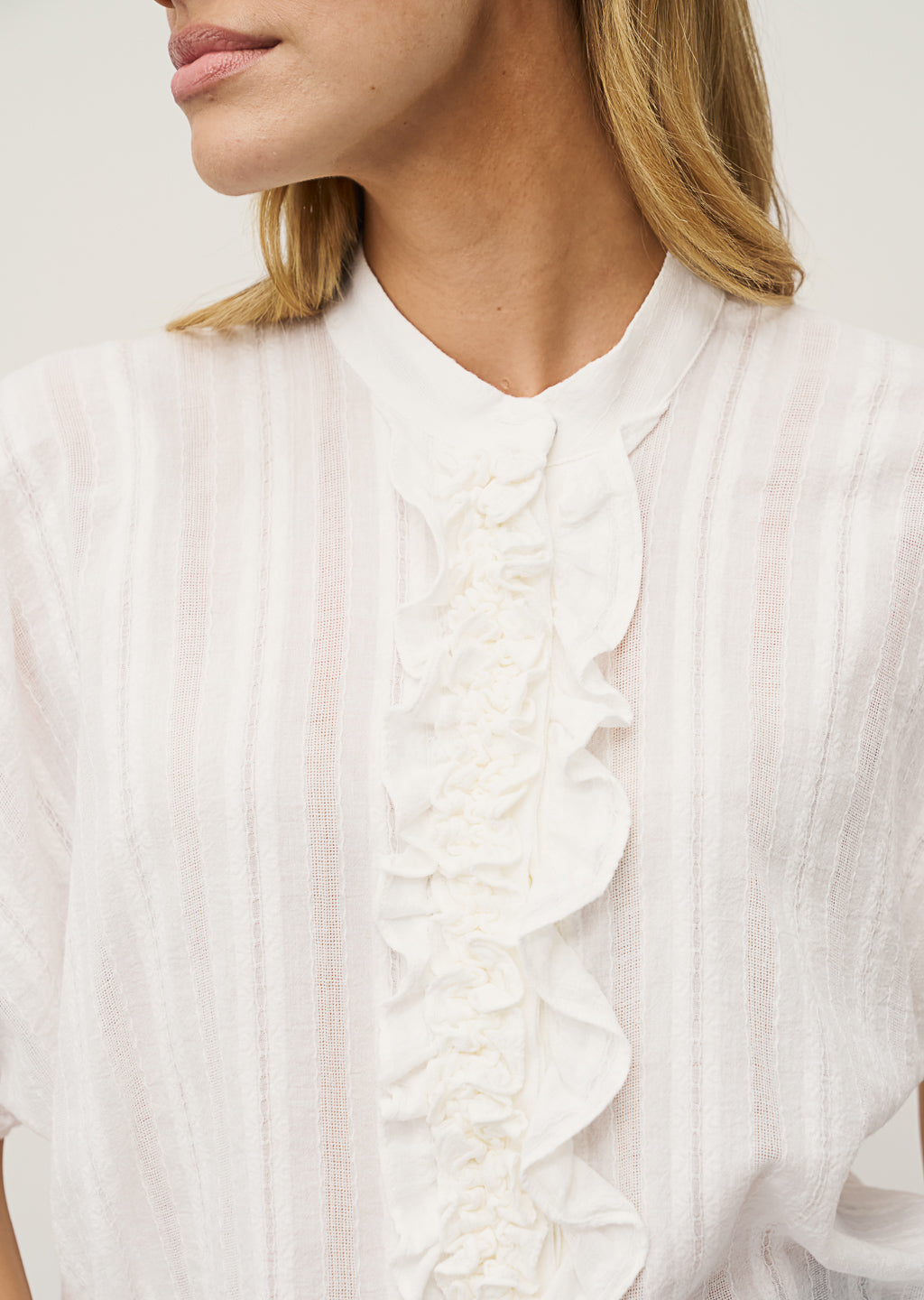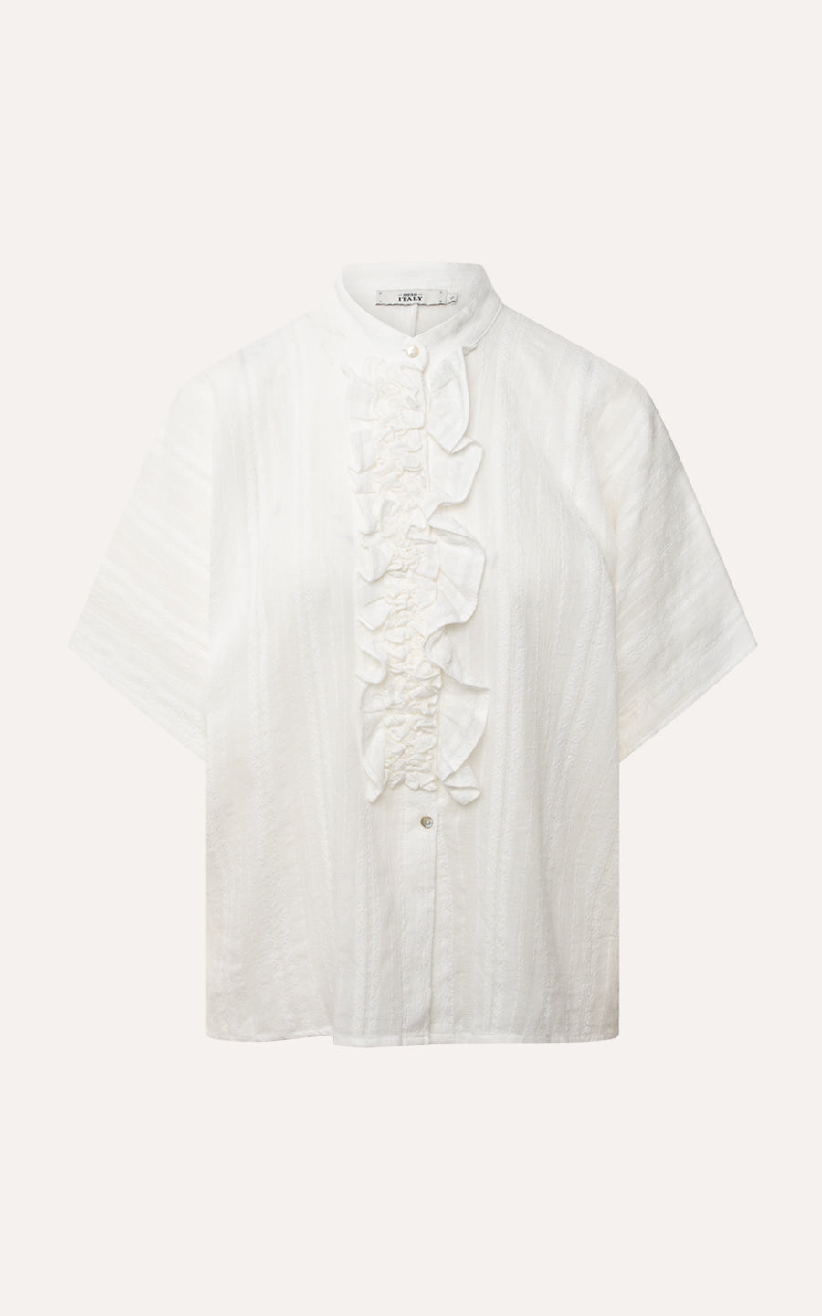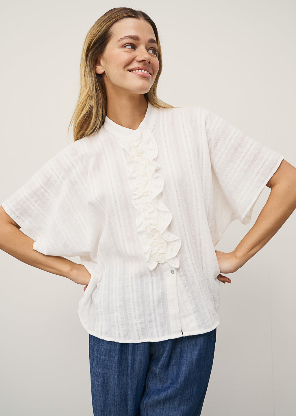 Der elegante Stehkragen verleiht der Bluse eine moderne Note, während die durchgehende Knopfleiste mit zartem Rüschendetail feminine Akzente setzt.