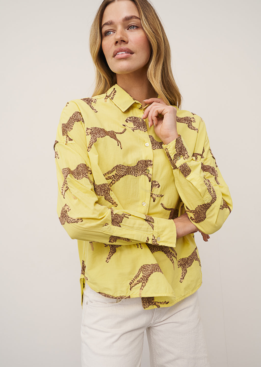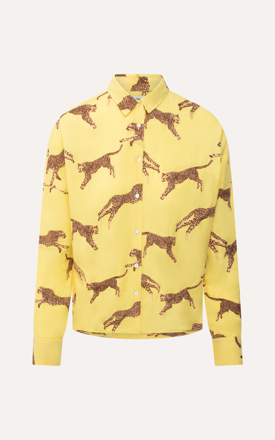 Ein klassischer Hemdblusenkragen und die durchgehende, offene Knopfleiste unterstreichen das zeitlose Design.
