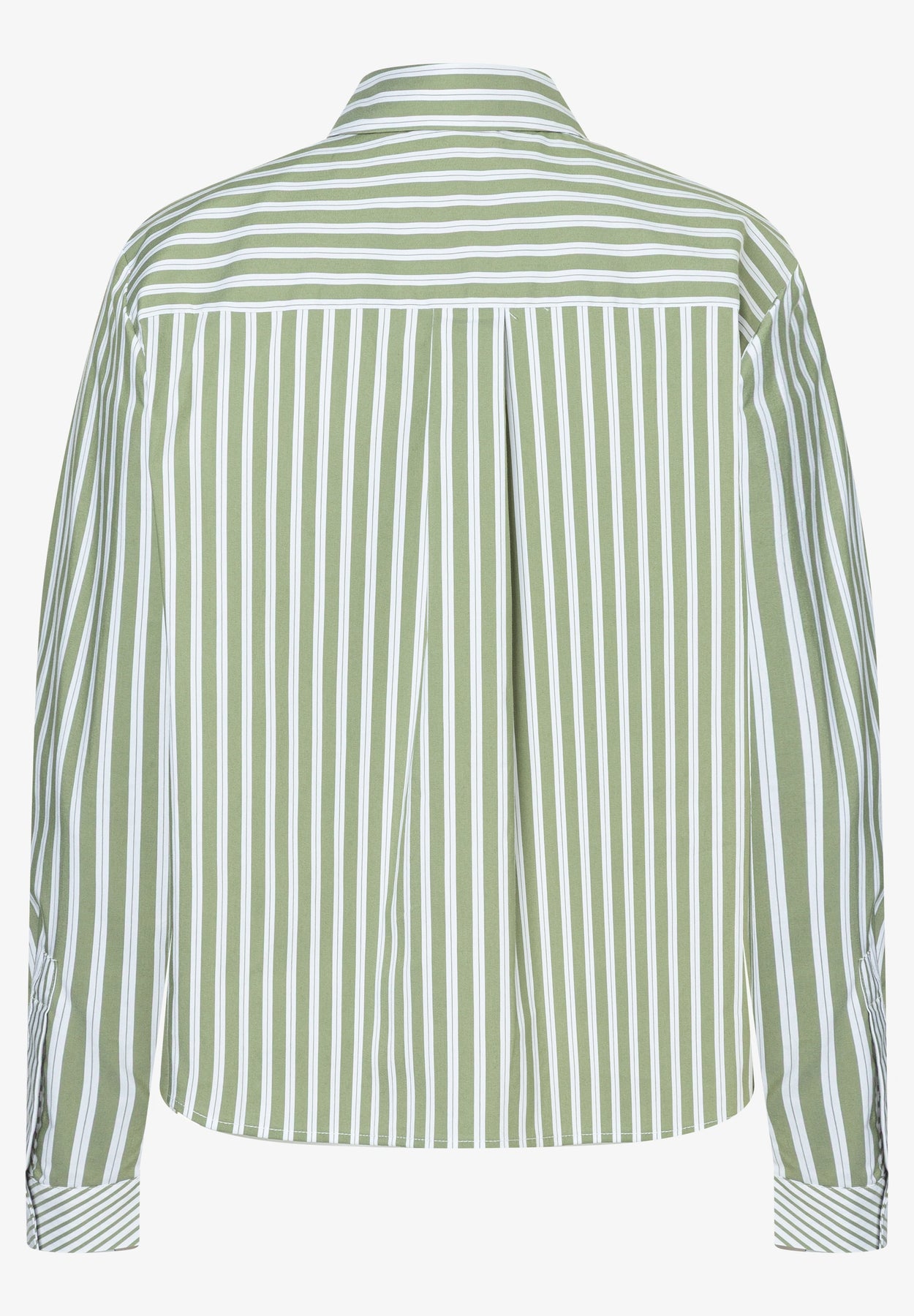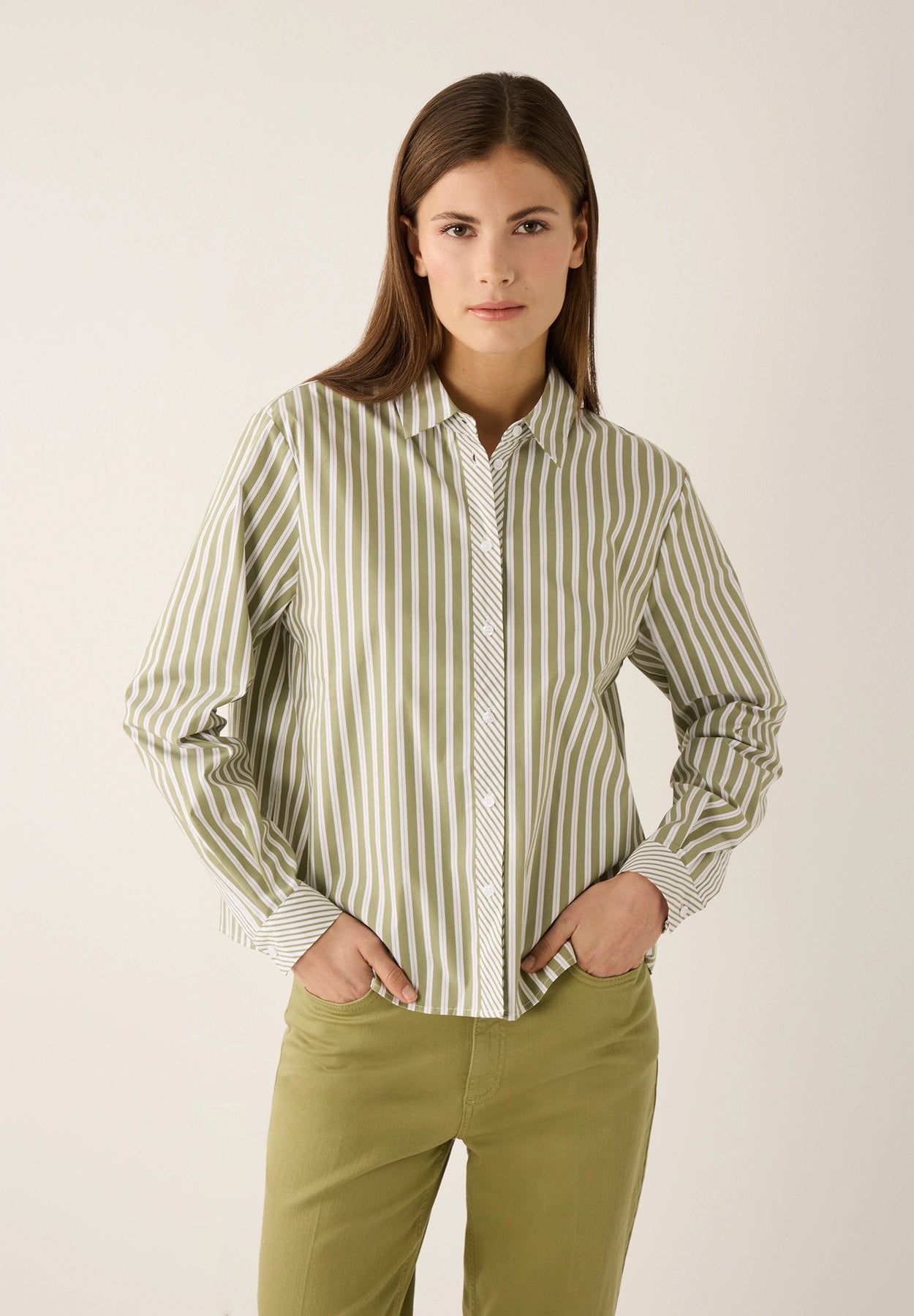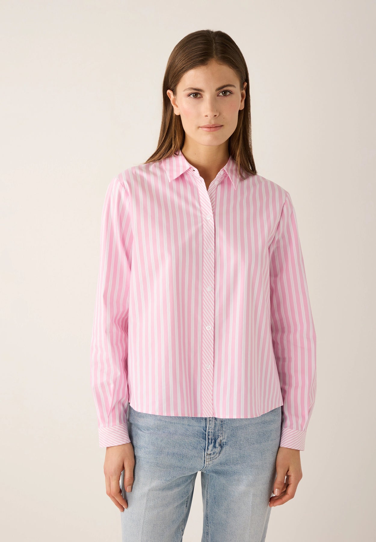 Die langen Ärmel, der klassische Hemdblusenkragen und die durchgehende Knopfleiste sorgen für einen cleanen, strukturierten Look, während der Boxy-Fit ihr ein modernes Update verleiht.