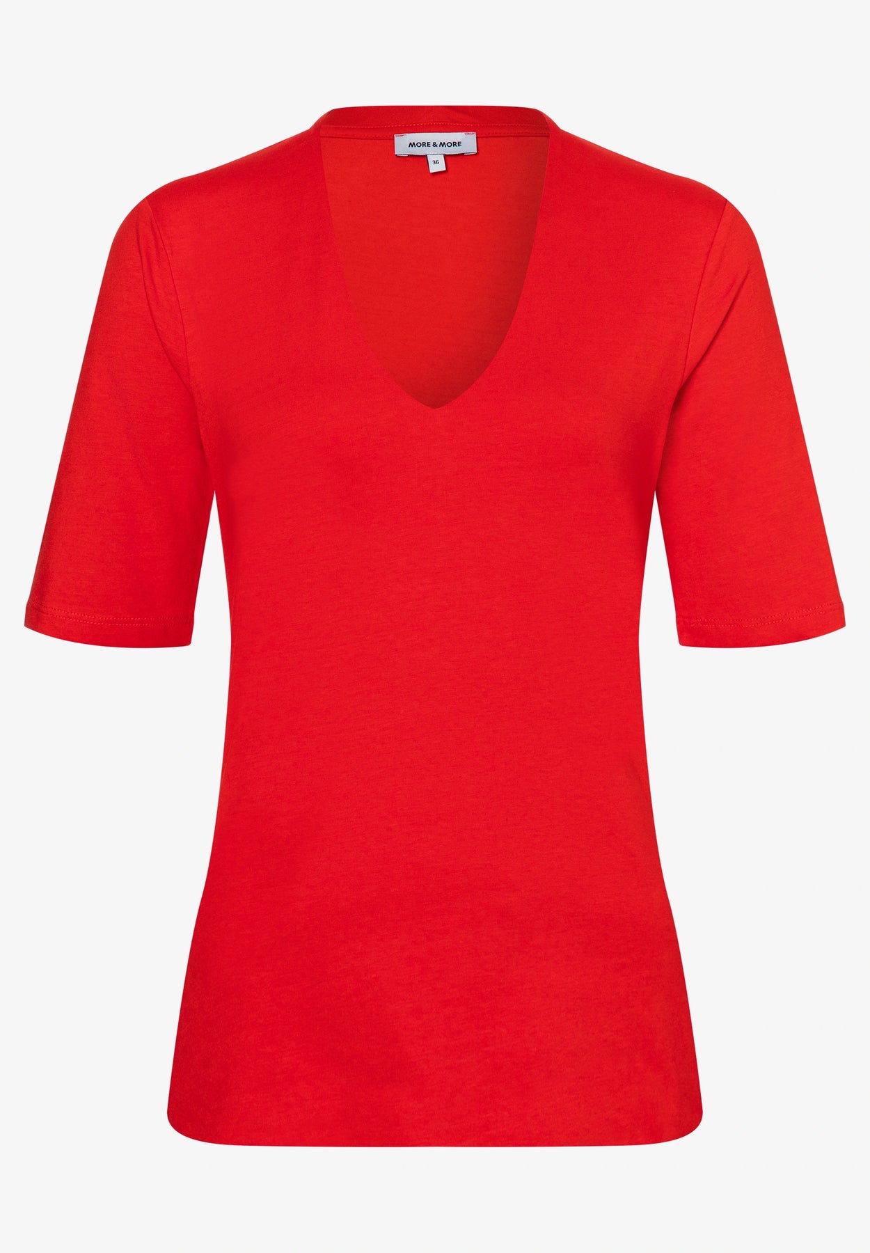 Normaler Preis CHF 59.90Das Basic Shirt von MORE & MORE mit femininem V-Ausschnitt und gedoppelter Front ist ein toller Allrounder, der sich sehr vielseitig kombinieren lässt und in keinem Kleiderschrank fehlen sollte.