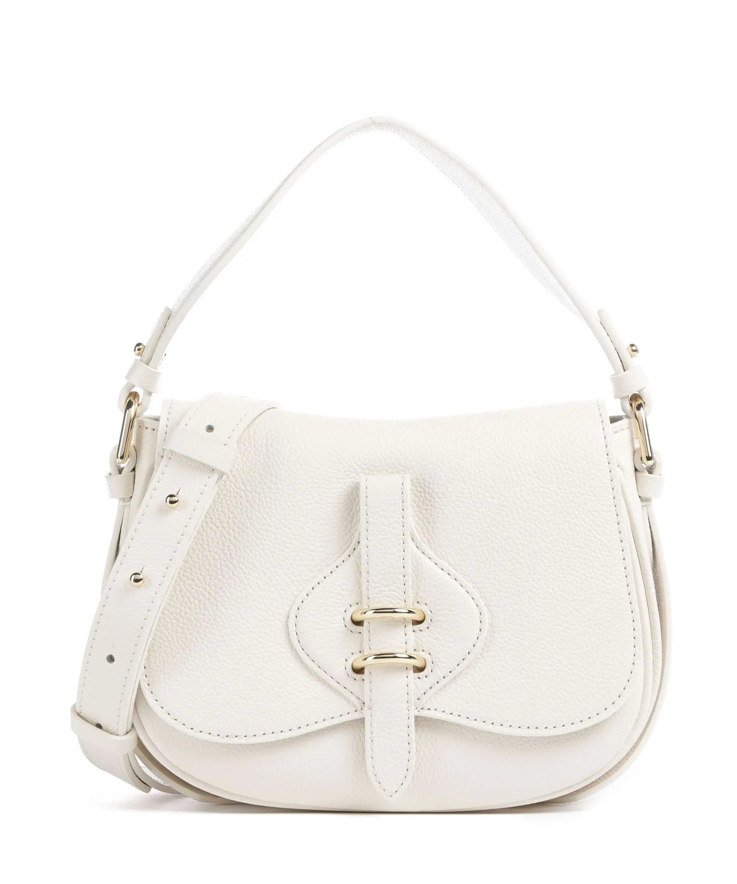 Die Handtasche zeichnet sich durch ein raffiniertes Lederdetail auf der Vorderseite aus, inspiriert von der Welt der Sattlerkunst, das mit zwei glänzenden Akzenten betont wird, die ihren wertvollen Charakter hervorheben.