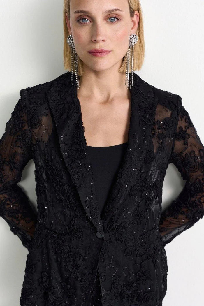 Dieser schwarze Blazer von RICH&ROYAL kombiniert klassisches Tailoring mit floralen 3D-Applikationen und feinen Pailletten.