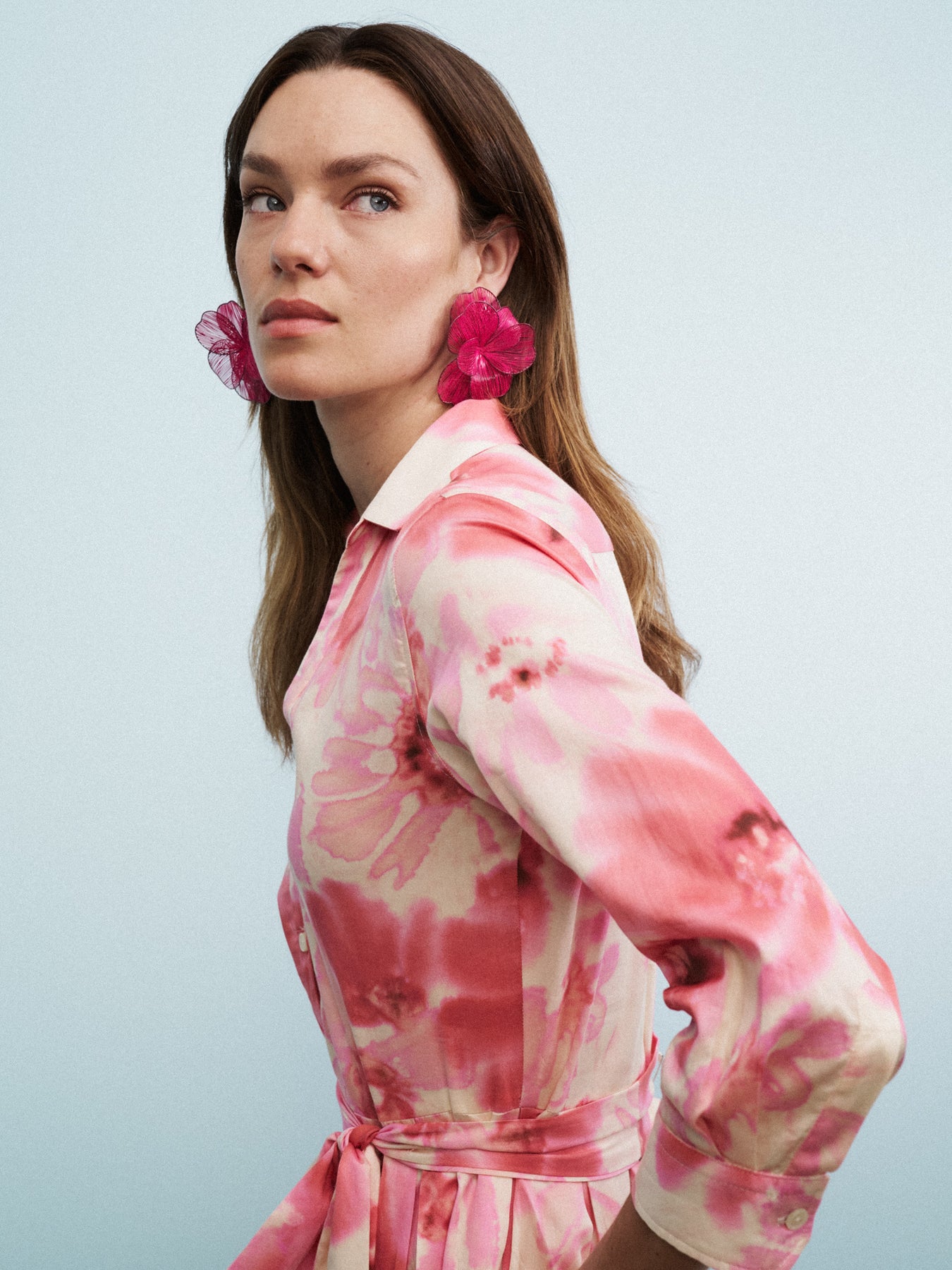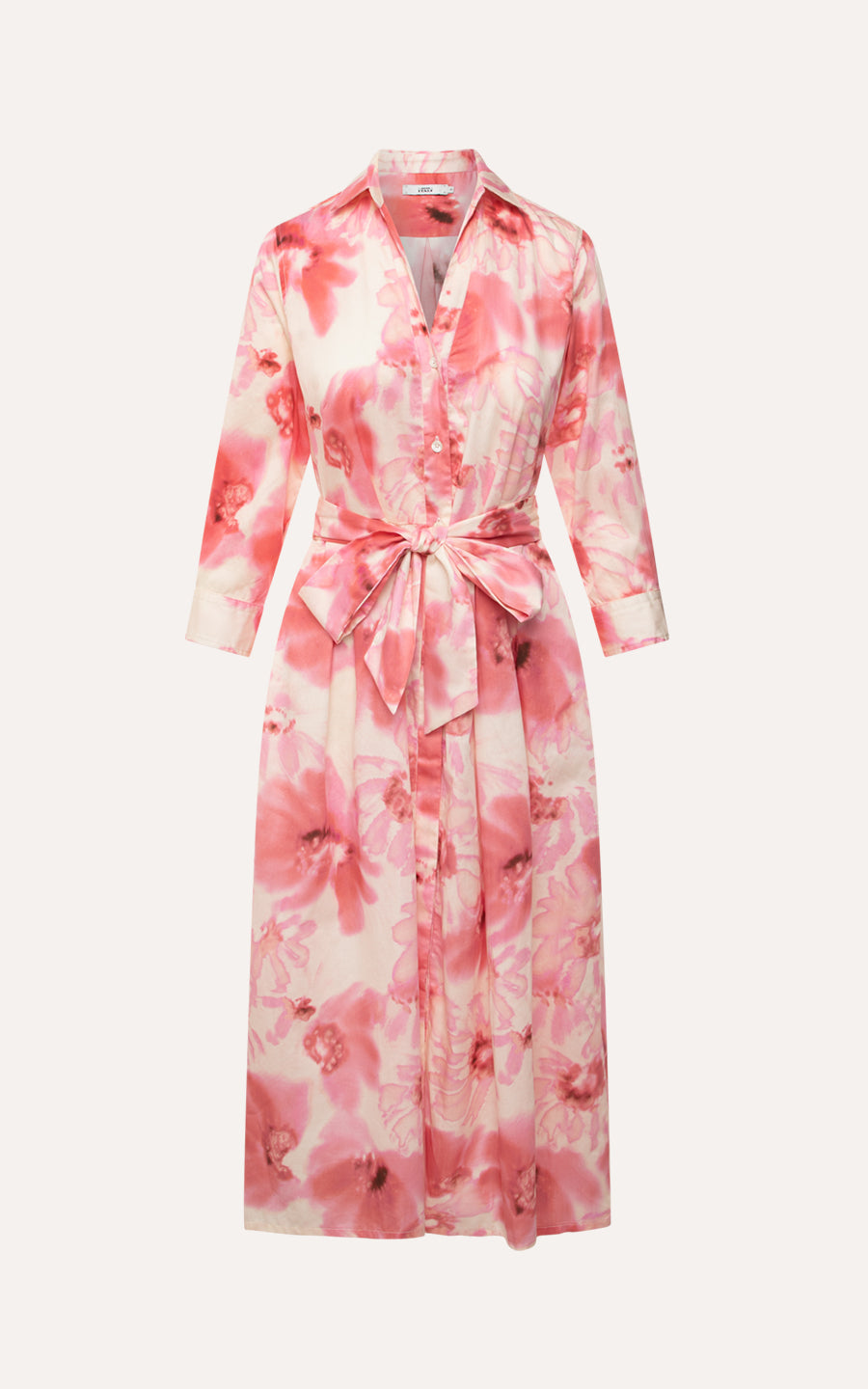Der klassische Hemdblusenkragen und die durchgehende Knopfleiste verleihen dem Midikleid einen modernen, zugleich stilvollen Charakter.